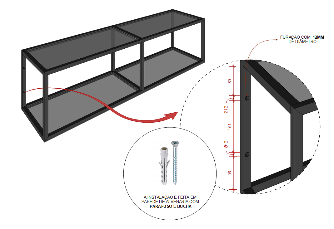 ATENÇÃO: A sustentação da estrutura depende diretamente de sua fixação, portanto é necessário avaliar o local de instalação e conhecer a parede em que será aplicada, avaliando as medidas e verificando se não é um ponto hidráulico, elétrico, de gás ou mesmo se não há vigas, tijolo oco, ou "parede fofa", pois esses são itens que podem interferir no desempenho final do produto.
