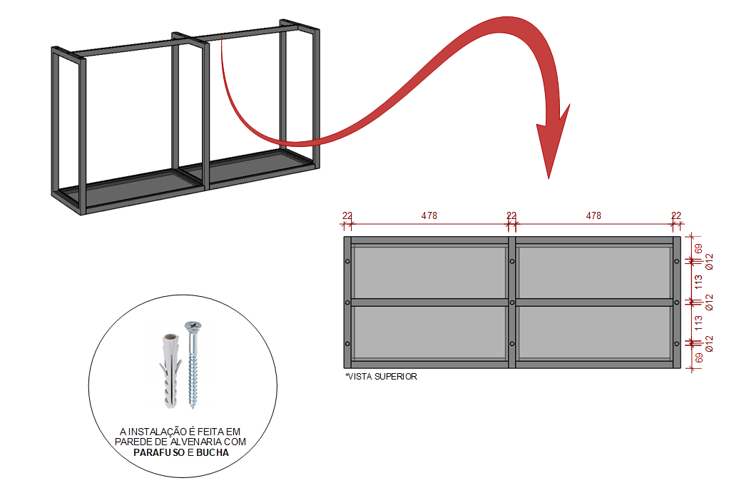 ATENÇÃO: A sustentação da estrutura depende diretamente de sua fixação, portanto é necessário avaliar o local de instalação e conhecer a parede em que será aplicada, avaliando as medidas e verificando se não é um ponto hidráulico, elétrico, de gás ou mesmo se não há vigas, tijolo oco, ou "parede fofa", pois esses são itens que podem interferir no desempenho final do produto.