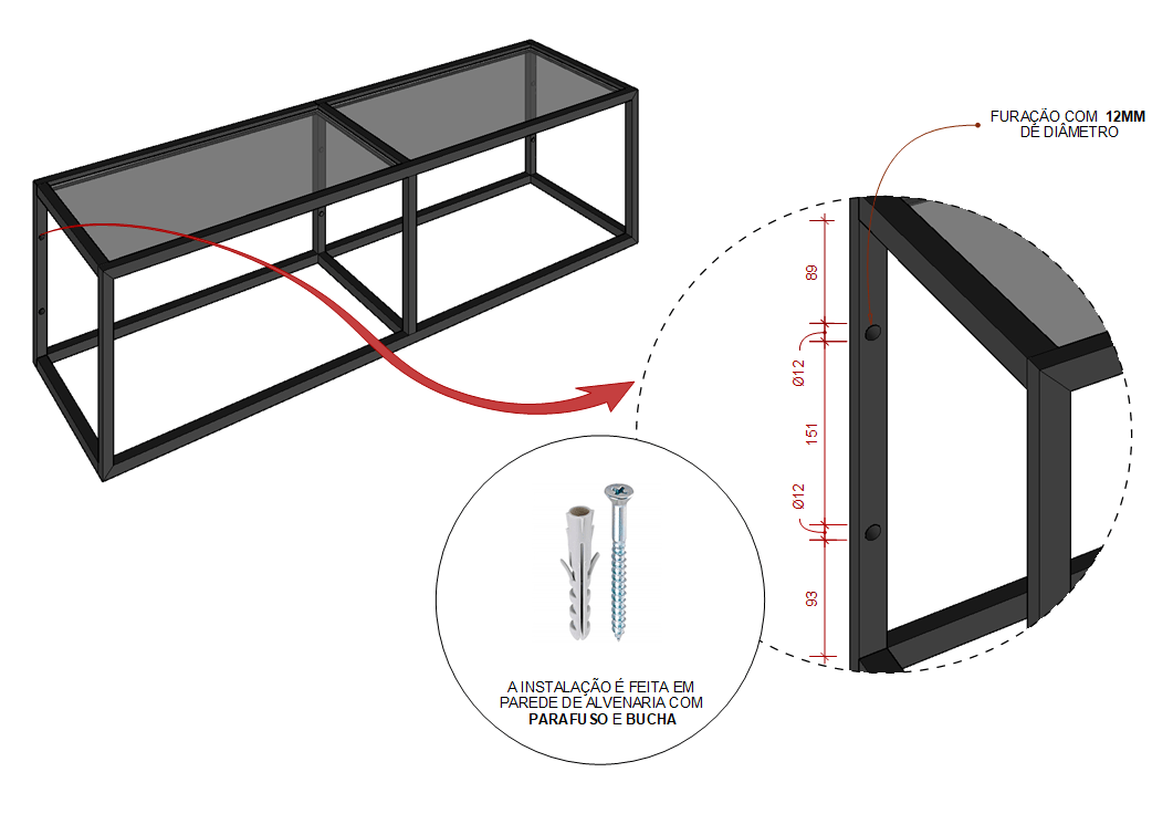 ATENÇÃO: A sustentação da estrutura depende diretamente de sua fixação, portanto é necessário avaliar o local de instalação e conhecer a parede em que será aplicada, avaliando as medidas e verificando se não é um ponto hidráulico, elétrico, de gás ou mesmo se não há vigas, tijolo oco, ou "parede fofa", pois esses são itens que podem interferir no desempenho final do produto.