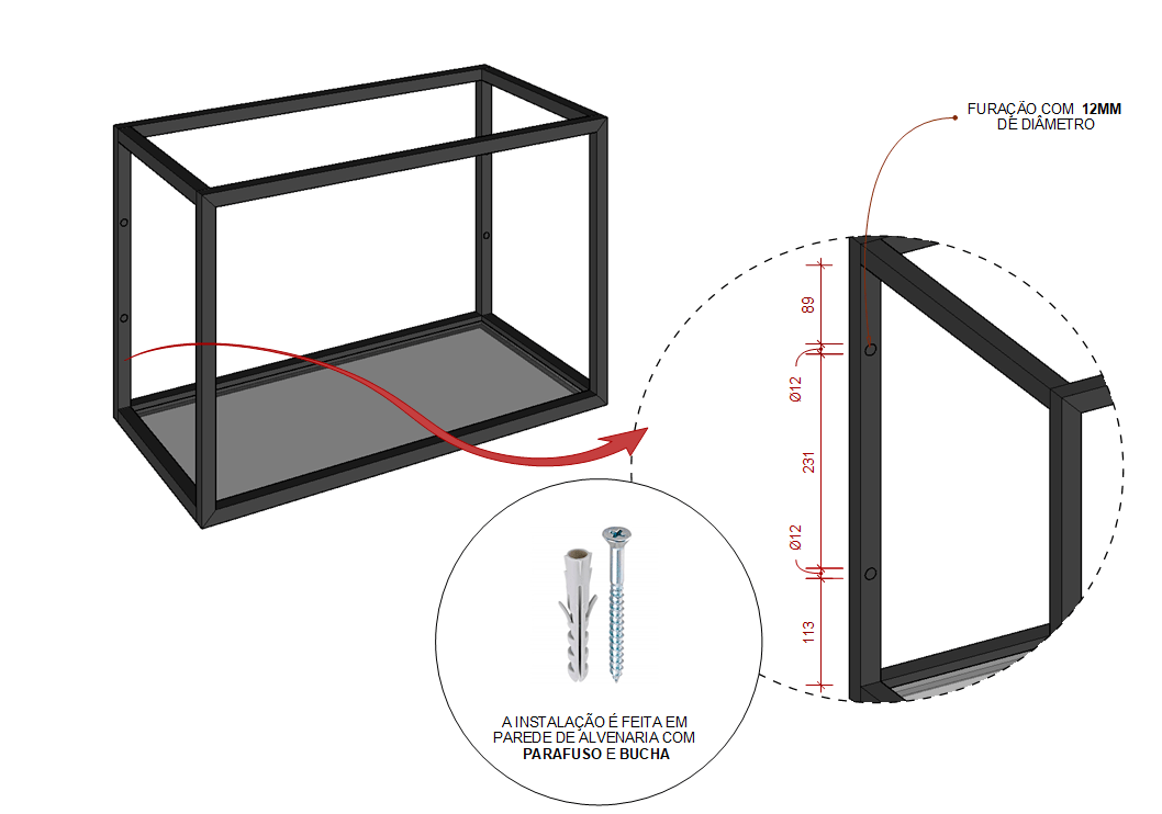 ATENÇÃO: A sustentação da estrutura depende diretamente de sua fixação, portanto é necessário avaliar o local de instalação e conhecer a parede em que será aplicada, avaliando as medidas e verificando se não é um ponto hidráulico, elétrico, de gás ou mesmo se não há vigas, tijolo oco, ou "parede fofa", pois esses são itens que podem interferir no desempenho final do produto.