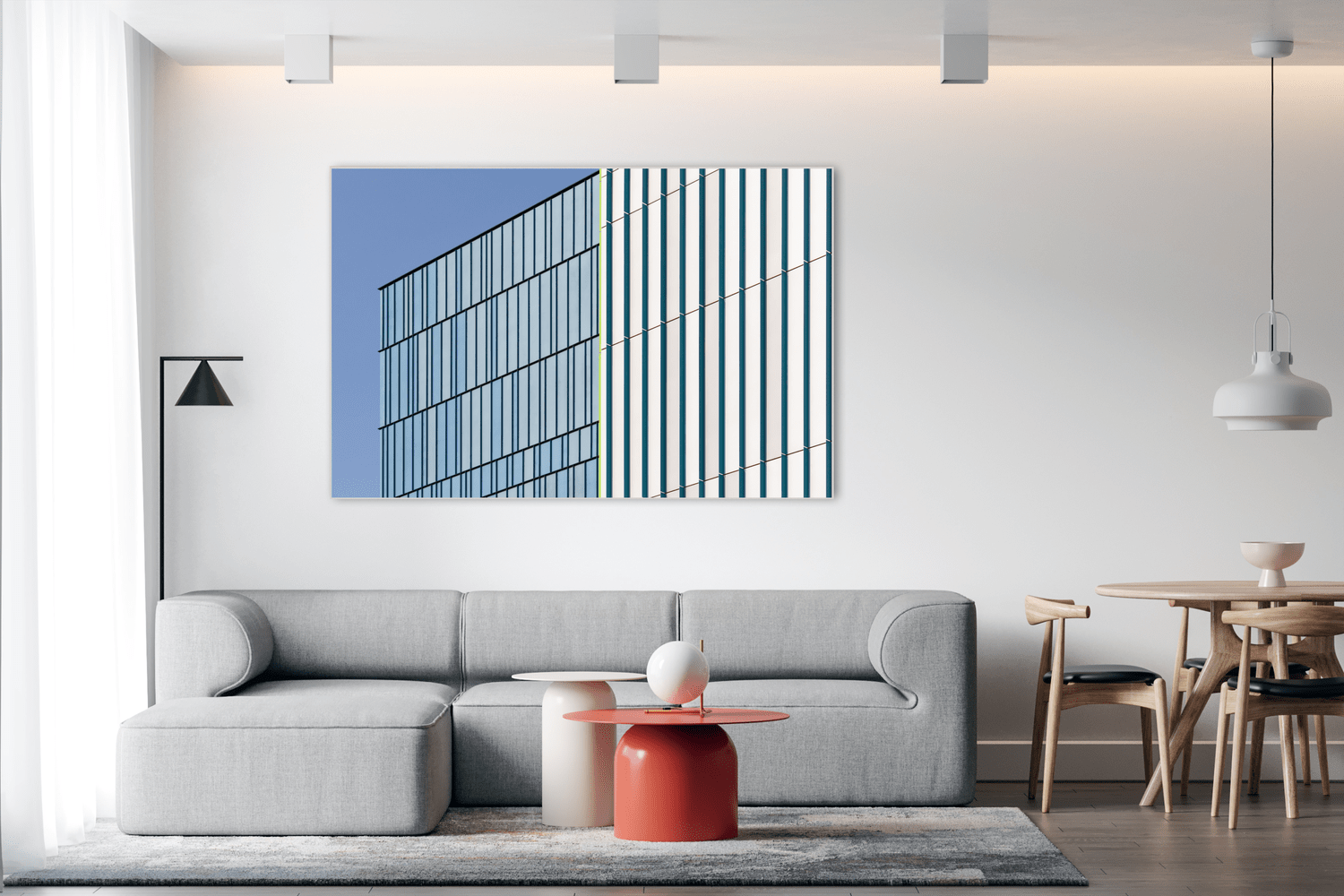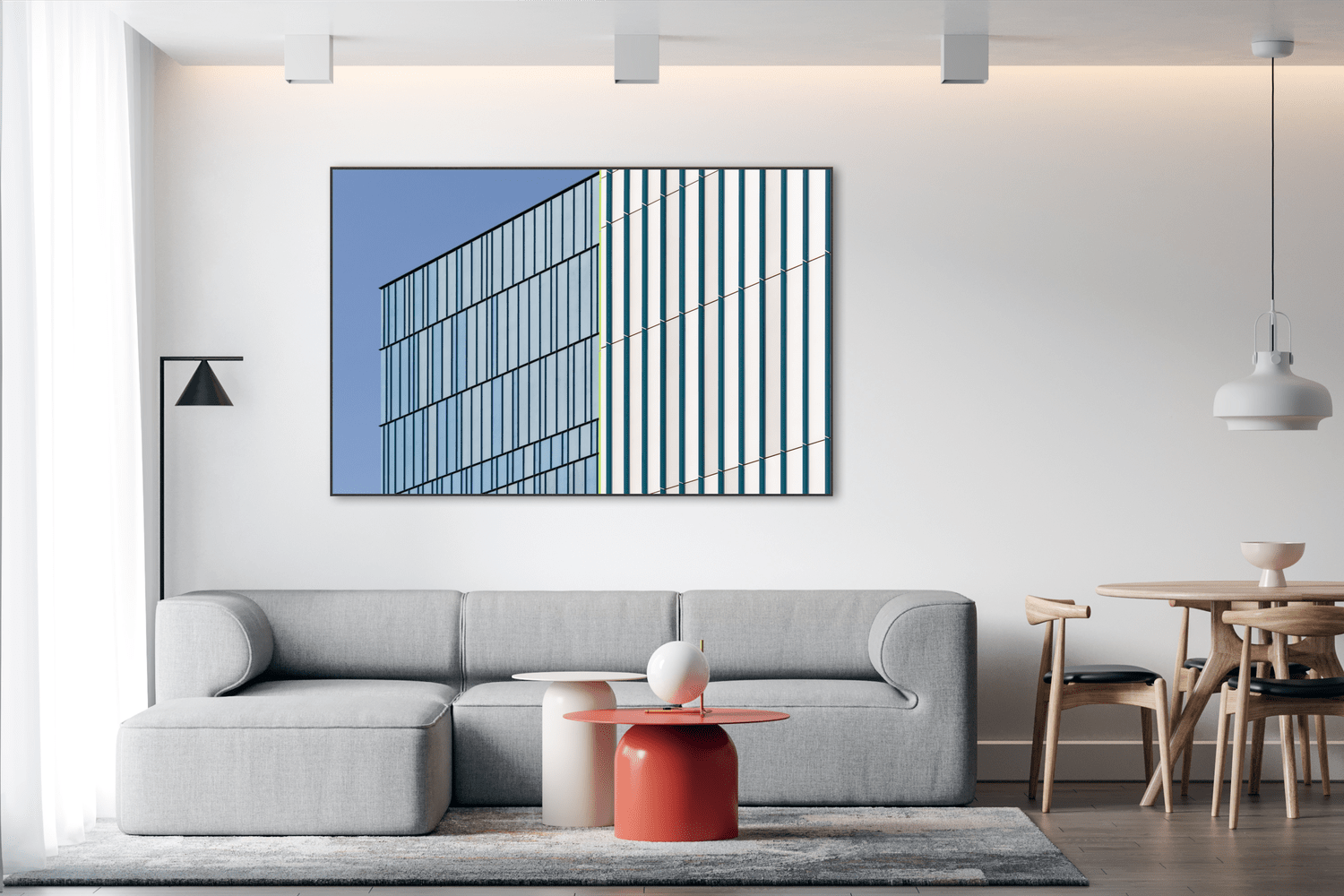 Desenvolvido pela Dublin Complementos, juntamente com o artista e fotógrafo Ivan Araújo, o quadro "Fachada Contemporânea em Dia de Céu Azul" é uma obra única e destaca-se por possuir moldura slim em alumínio com acabamento pintado, no vidro Clear 4mm e impressão digital de alta qualidade, feita diretamente no vidro e está disponível em diversos tamanhos, com as medidas em milímetros.