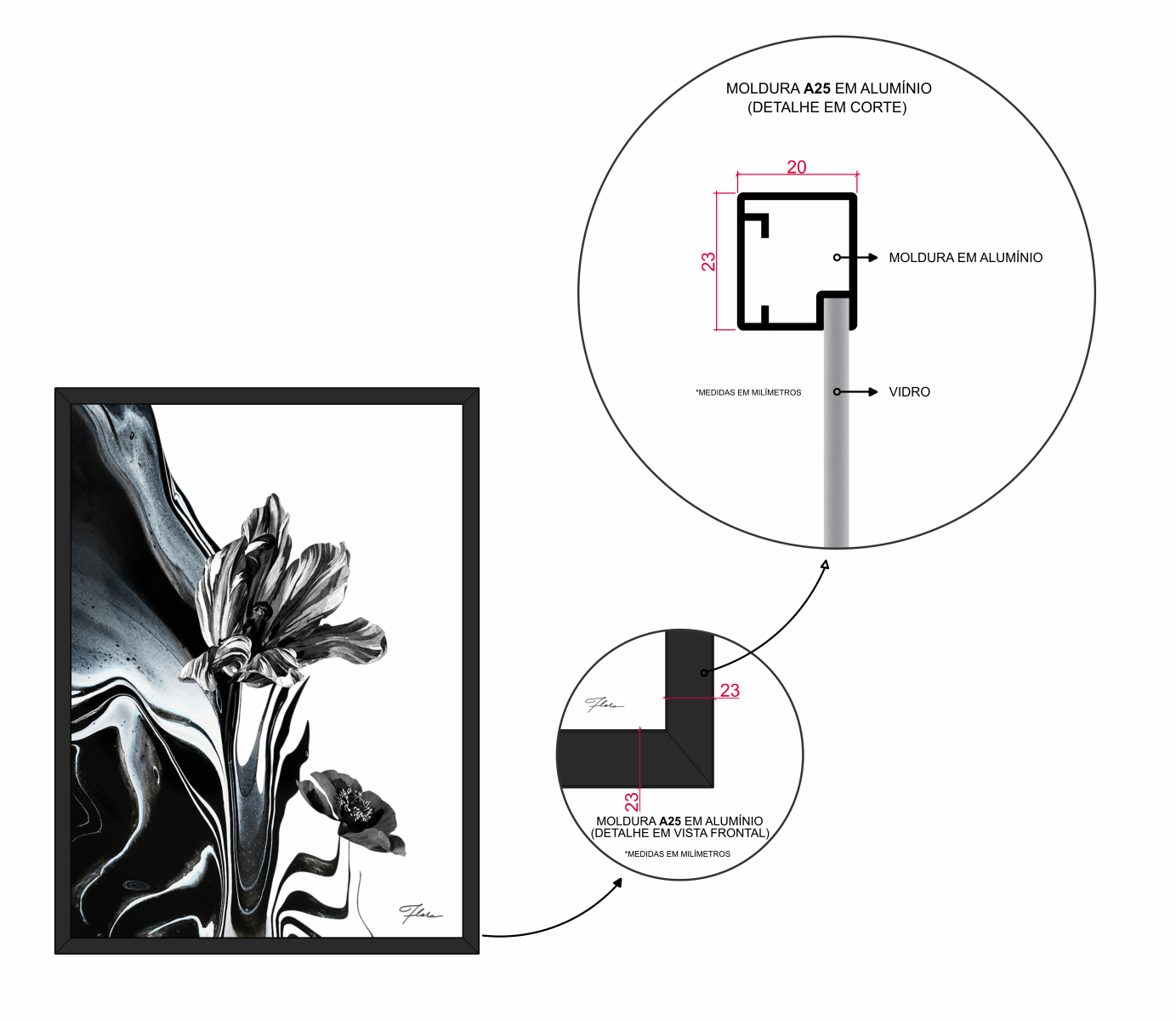 Desenvolvido pela Dublin Complementos, juntamente com o Estúdio Flora, o quadro "Flor em Brisa", retrata uma flor que nasce e se expande suavemente, como levada pelo vento, onde a delicadeza do movimento encontra a liberdade da natureza, criando uma sensação de leveza e tranquilidade, com traços e cores pensados para transmitir serenidade, ao mesmo tempo em que convida o observador a se conectar com a sutileza do instante. É mais que uma obra, é um suspiro de poesia, uma dança suave entre o abstrato e a vida. Possui moldura slim em alumínio com acabamento pintado, no vidro Clear 4mm (Transparente) e impressão digital de alta qualidade, feita diretamente no vidro e está disponível em diversos tamanhos, com as medidas em milímetros.