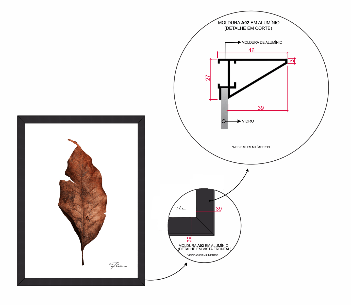 Desenvolvido pela Dublin Complementos, o Estúdio Flora traz o quadro "Folha Seca", é um instante de contemplação suspenso no tempo. A obra convida a perceber a beleza da simplicidade e a serenidade da natureza em sua forma mais pura, sendo uma celebração da passagem do tempo, da delicadeza e da quietude que nos lembram que há poesia até nos momento mais silenciosos. Possui moldura robusta em alumínio com acabamento pintado, no vidro Clear 4mm (Transparente) e impressão digital de alta qualidade, feita diretamente no vidro e está disponível em diversos tamanhos, com as medidas em milímetros.