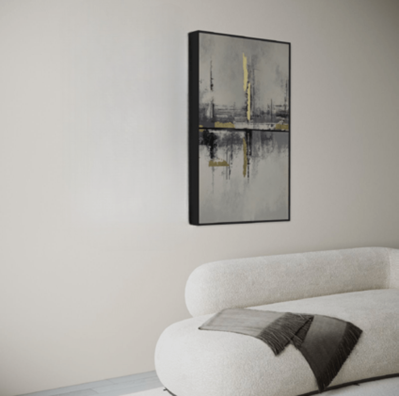 O quadro "Linhas Cinzas, Douradas e Pretas Folha de Ouro" é uma obra que incorpora folhas de ouro aplicadas à superfície do quadro, criando um efeito visual deslumbrante. É uma peça única e sua aplicação em quadros é frequentemente usada para agregar um toque de sofisticação, luxo e riqueza estética. Possui moldura de madeira em canvas e está disponível em diversas medidas.