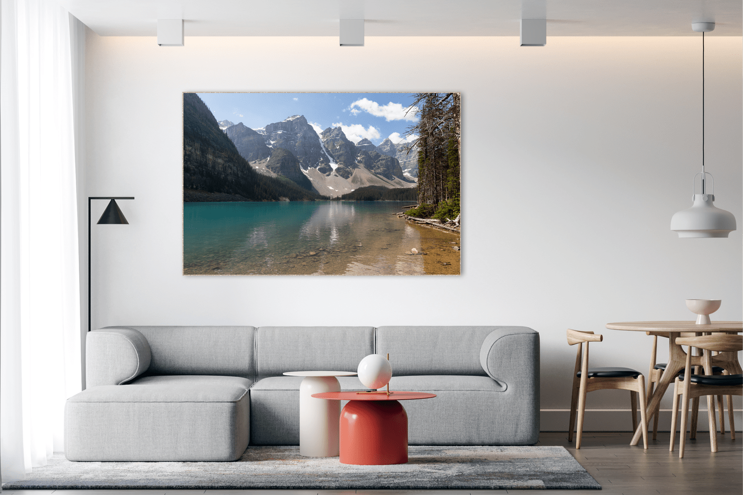 Desenvolvido pela Dublin Complementos, juntamente com o artista e fotógrafo Ivan Araújo, o quadro "Paisagem no Lago Moraine" retrata a beleza do mais antigo parque do Canadá, que é deslumbrante, repleto de montanhas e com quilômetros de florestas intactas, sendo assim uma obra única que trás personalidade para o ambiente em que for utilizado. Destaca-se por possuir moldura slim em alumínio com acabamento pintado, no vidro Clear 4mm e impressão digital de alta qualidade feita diretamente no vidro e está disponível em diversos tamanhos, com as medidas em milímetros.