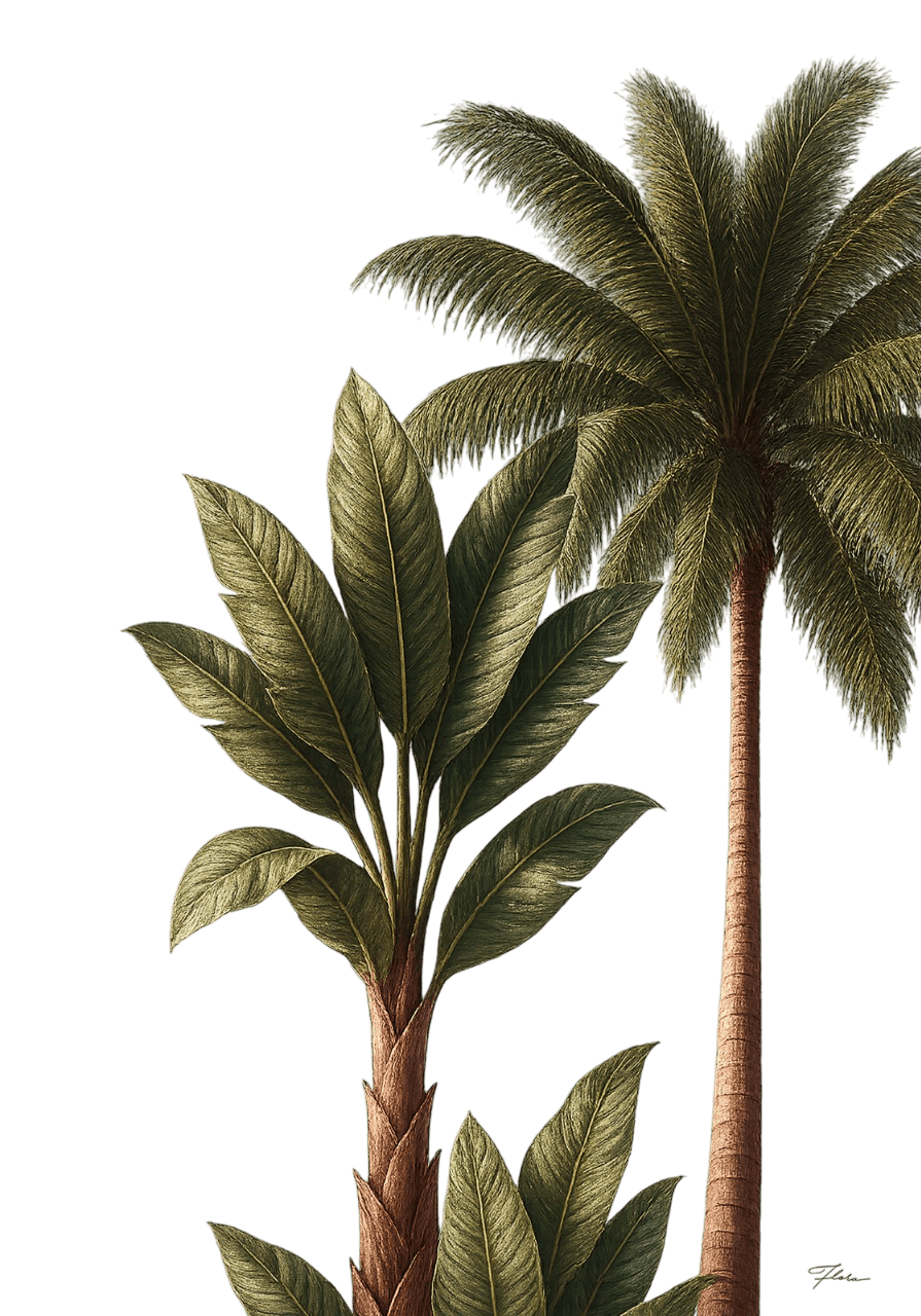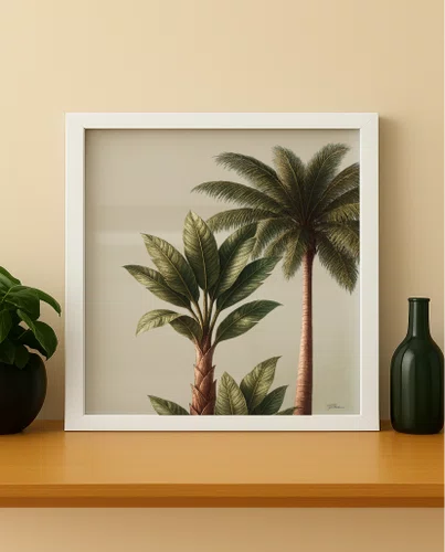 Desenvolvido pela Dublin Complementos, o Estúdio Flora traz o quadro "Tropical Sereno", retrata coqueiros que se elevam firmes e delicados, como colunas de um templo natural, onde sua sombra sugere abrigo e sua forma evoca movimento suave, sendo um instante de descanso que se adapta ao olhar e ao espaço. Possui moldura slim em alumínio com acabamento pintado, no vidro Clear 4mm (Transparente) e impressão digital de alta qualidade, feita diretamente no vidro e está disponível em diversos tamanhos, com as medidas em milímetros.